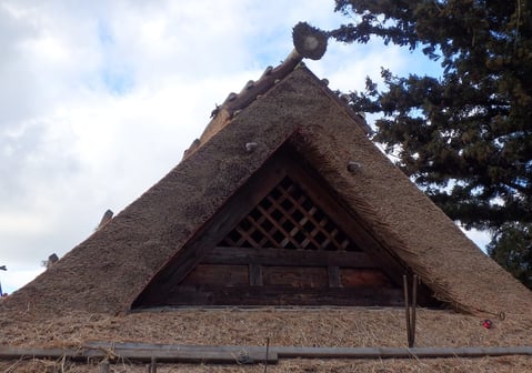 丸い竹を屋根のてっぺんに安定させるには、竹の腹側をV字に削りとって、ピタリと屋根のてっぺんにはめなければならない。しかし、茅で作る屋根は木材を加工したように正確に真っすぐではない。そして、載せる竹もどうしても多少曲がっている。