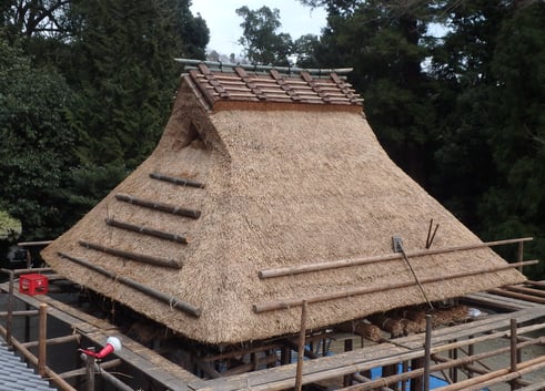 来る日も来る日も気が狂ったように茅を葺き、早や3月末。さすがに体がギシギシだが、おかげで完成が見えてきた。