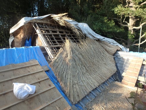 今回の現場は、そういう意味でのやくものが多い。段違い、斜め軒、茅屋根に垂直に交わる棟瓦、東側は入母屋、西側は切妻…などなど。ひとつひとつはやくものと呼ぶほどのものでもない。だが、今回くらいの小さな屋根にこうもたくさん特殊な箇所があると、もはや"普通の部分"が少ない。結果的に、やくもの同士を上手につなげていくことで、屋根が出来上がっていくことになる。これがなかなか難しい。