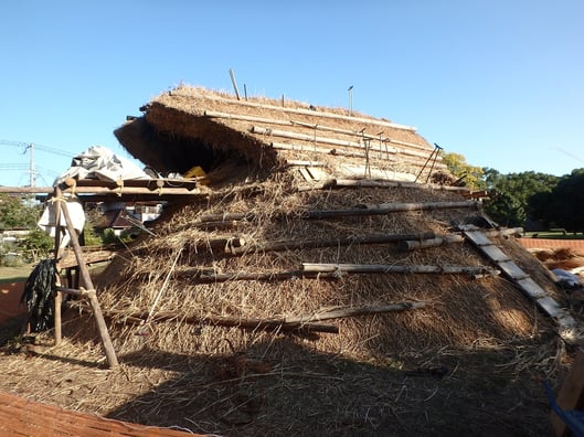 間もなく作業は棟に取り掛かる。最後の難所だが、それを乗り越えれば仕上げに取り掛かれる。武骨な感じにとりあえず葺き上がってきた屋根を、刈り込んで成形し、この屋根が持つ本当の美しい部分を早くお披露目したい。