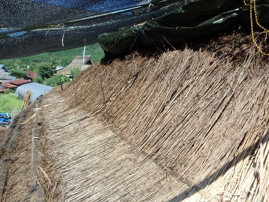 難しく言えば、『葺き茅の勾配調整のために事前に仕込んでおく茅』のことであるが、イメージしやすく言えば、これから並べようとする茅のために、事前に枕を置いておいてあげるようなものだ。これにより、並べた茅の頭(=穂先側)がグイと手前に起き上がる形になる・・・つまり、茅がしなる。茅はしならせることで、固く抜けにくい屋根となる。