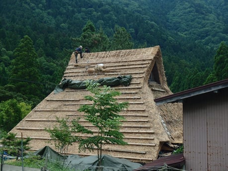 初夏の美山の週末ともなれば、ツーリングの客も多い。毎日多くの人が通り掛かり、車や自転車をとめて茅葺き作業の様子をカメラに収めていく。こちらは淡々と作業を続けるのみだが、屋根から降りて見上げれば、なるほど写真を撮りたくなる絵だなとも思う。