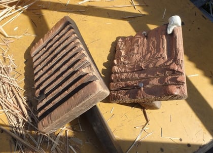 『たたき』と呼んでいる、毎日の茅葺き作業で最も使用率の高い道具。並べた茅を屋根の勾配に叩き均すための必需品だ。